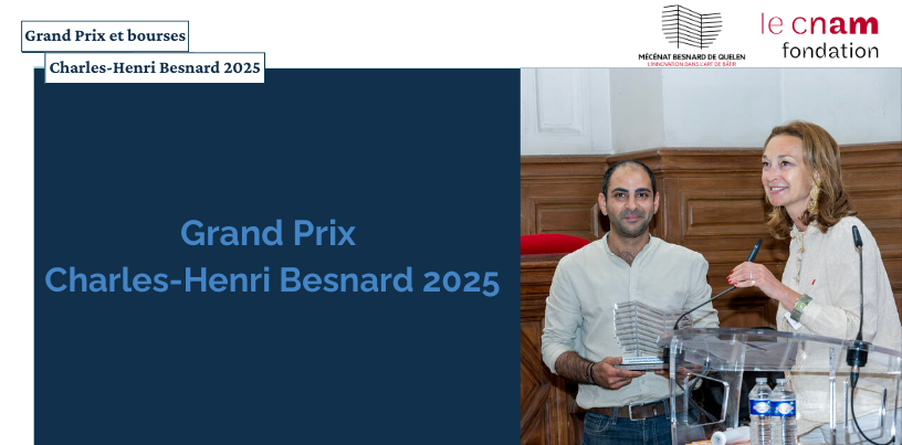 Grand Prix et Bourses Charles-Henri Besnard 2025 : la Fondation du Cnam récompense 7 jeunes talents de l’innovation dans la construction.18 juin 2025Le 2 juin 2025, la Fondation du Cnam a distingué sept lauréats lors de la cérémonie officielle de remise du Grand Prix et des Bourses Charles-Henri Besnard, organisée au Conservatoire national des arts et métiers. Cette soirée, ponctuée d'un retour sur les éditions 2019 et 2021, s’est poursuivie autour d’un cocktail à l’Église Saint-Martin-des-Champs du musée des Arts et Métiers, en présence des lauréats, d’enseignants-chercheurs du Cnam et des membres du jury. -